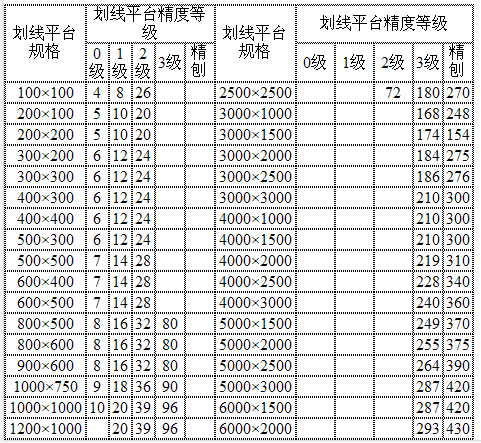 劃線平臺(tái)精度:按國家標(biāo)準(zhǔn)計(jì)量檢定規(guī)程執(zhí)行,分別為0、1、2、3四個(gè)等級(jí)。