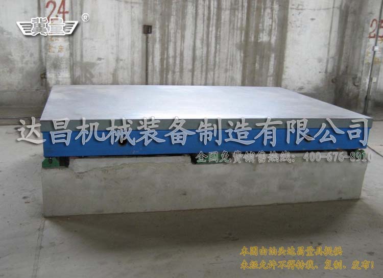 一般鑄鐵平臺的調(diào)平都是采用方型的調(diào)整墊鐵,根據(jù)平臺的重量及使用來確定所需墊鐵的規(guī)格。如一塊2000*4000的鑄鐵平臺,一般至少需要用到六塊墊鐵,墊在鑄鐵平臺的四角及4米方向兩側(cè)的中間位置,鑄鐵平臺及工件重量一共為5T的重量時,至少要選用規(guī)格為200*100*60的S83型調(diào)整墊鐵,當(dāng)然大于此規(guī)的墊鐵也是可以的。具體調(diào)平方法為:吊裝平臺,把六塊墊鐵放置好,裝鑄鐵平臺放置在墊鐵上,調(diào)整墊鐵,使各墊鐵均勻胎受力,用水平測量儀器(水平尺或電子水平儀)檢測鑄鐵平臺水平狀況,調(diào)整墊鐵上面的螺栓,直到符合水平位置。初次調(diào)平后,需靜置12小時,然后再次檢測,如不合格需進行再次調(diào)整,合格后方可使用。鑄鐵平臺需要根據(jù)使用情況定制進行維護,一般維護周期為6-12個月。