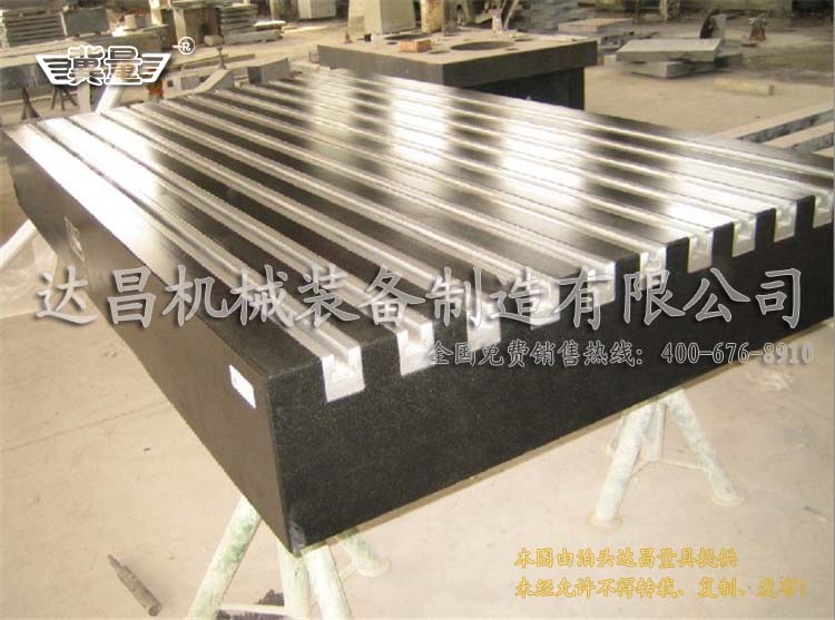 開T型槽的大理石平臺先把大理石平臺放到機床上面開出槽來,然后用小機床把金屬條加工好,加工好金屬條再把金屬條鑲嵌到大理石平臺上面的槽子里,使用專用膠粘接好